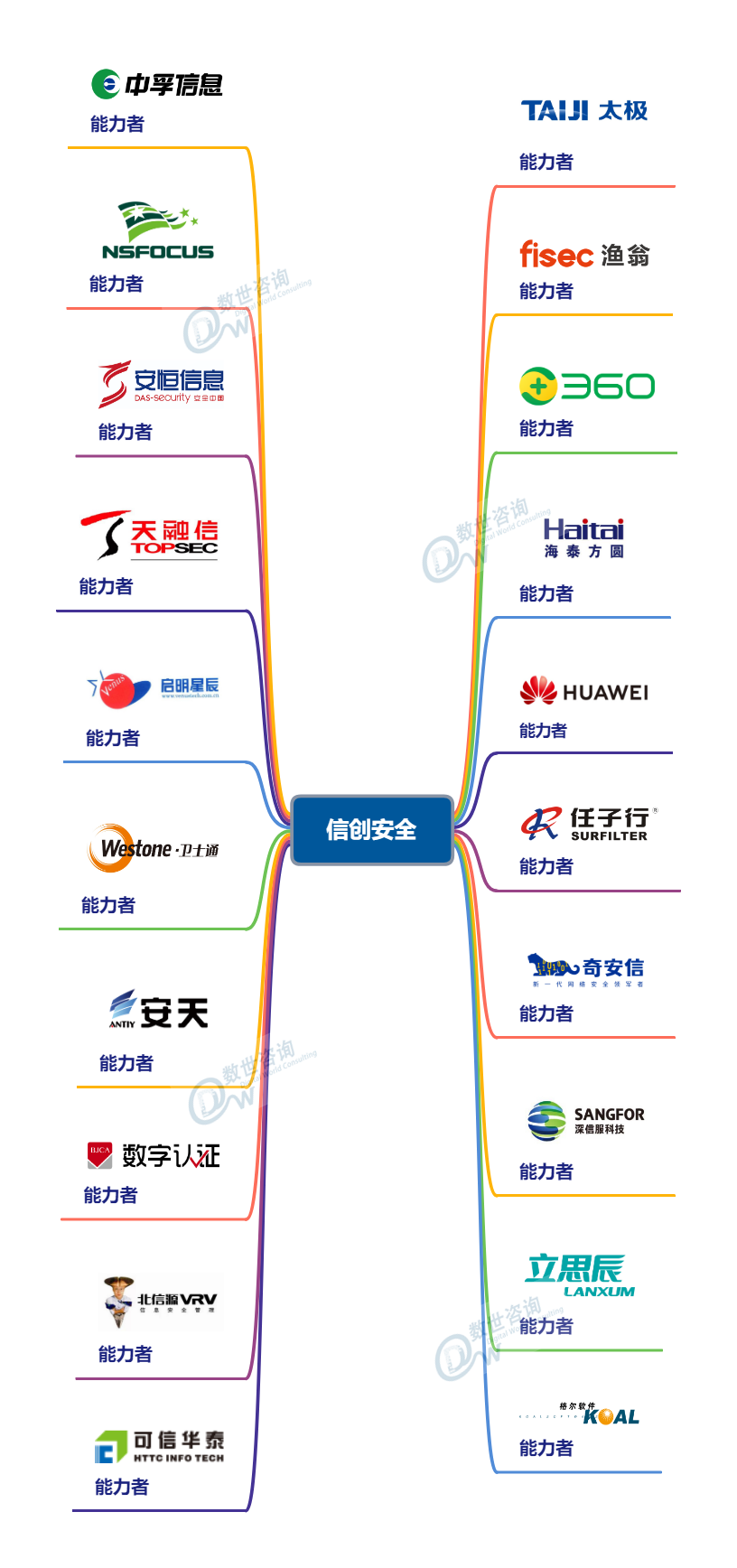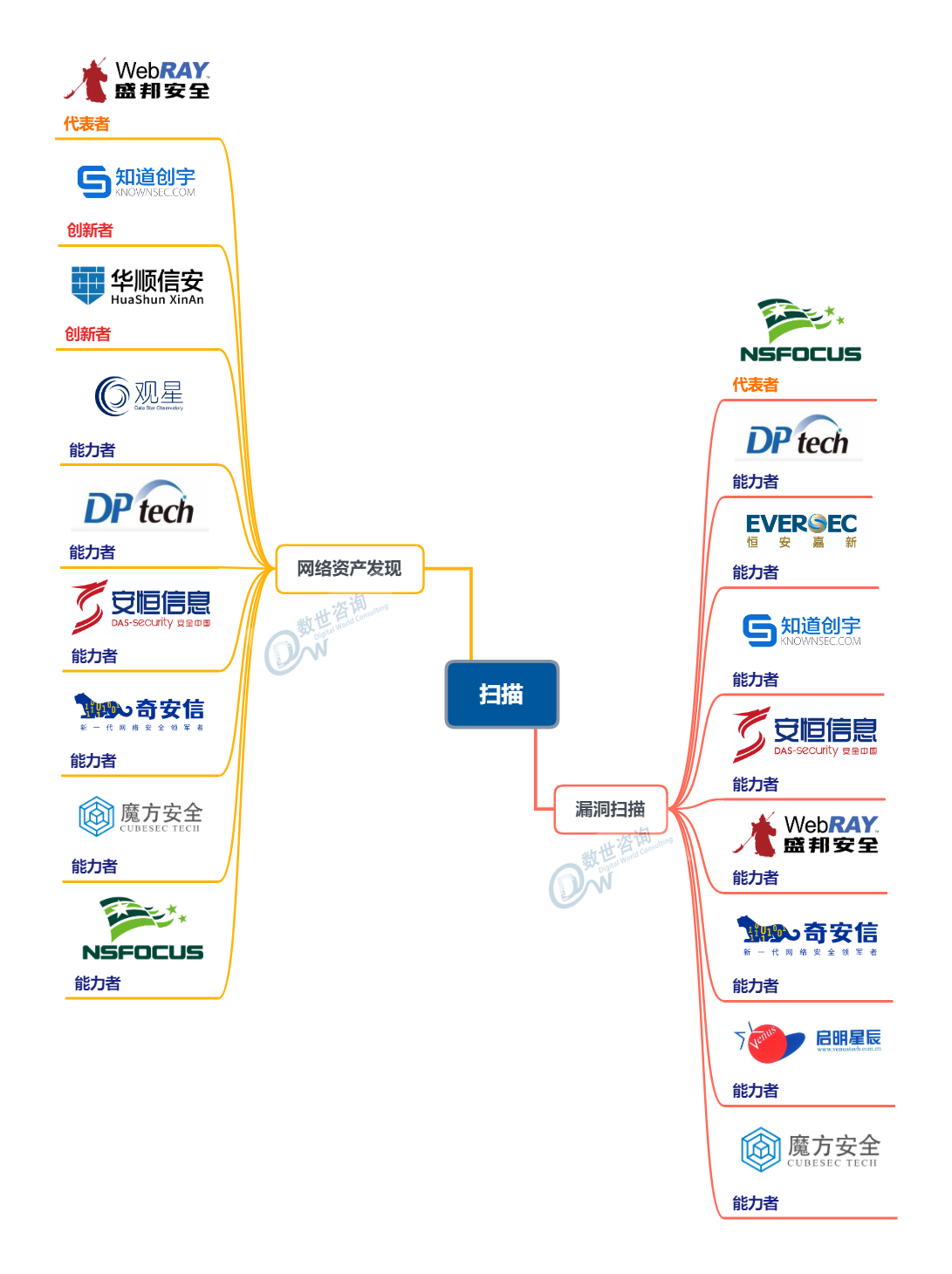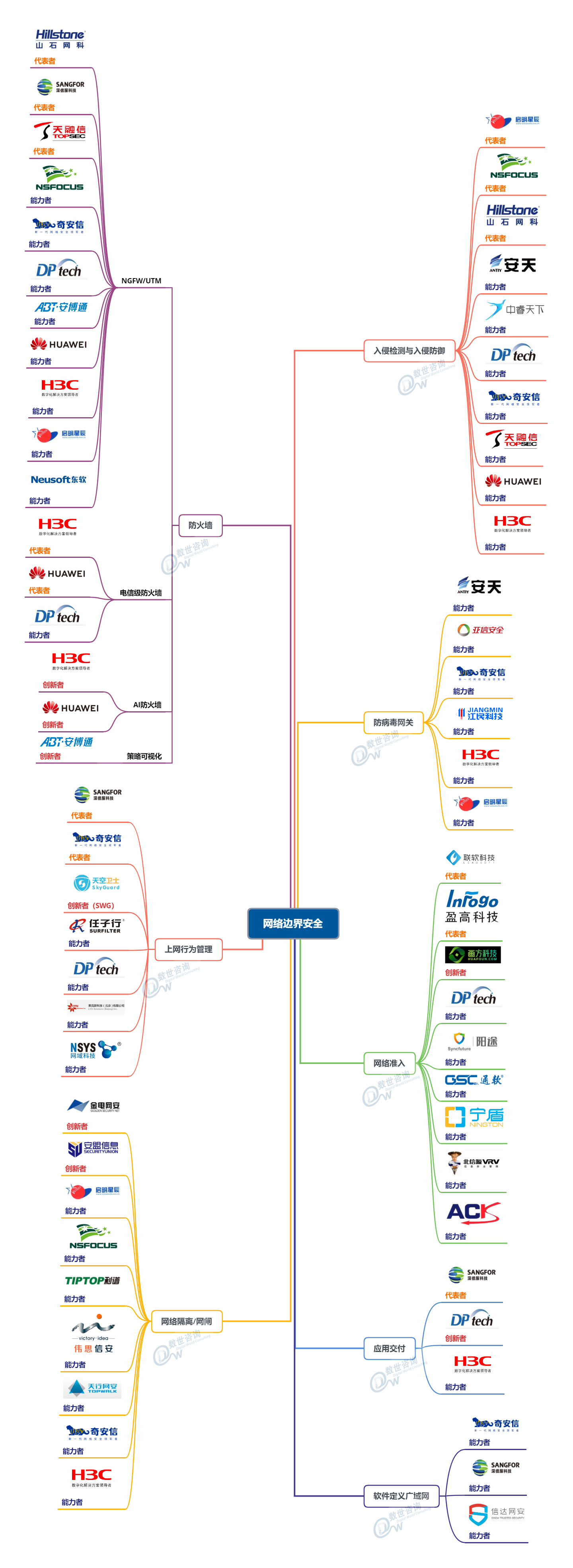 能力图谱最大的价值在于对网络安全分类的精细梳理,尝试降低业内由于分类混乱带来的沟通不便、统计不便、采购不便等弊端,降低供需双方的试错成本。同时,对相应分类杰出和优秀能力者进行了推荐。这些能力者的推荐因素有二,一是在某个分类中为主流或领先的提供商,二是极具技术特色或创新能力的提供商。能力者均由咨询团队经过大量的调研沟通工作,通过市场占比、销售收入、技术性创新和定位差异化等因素遴选。