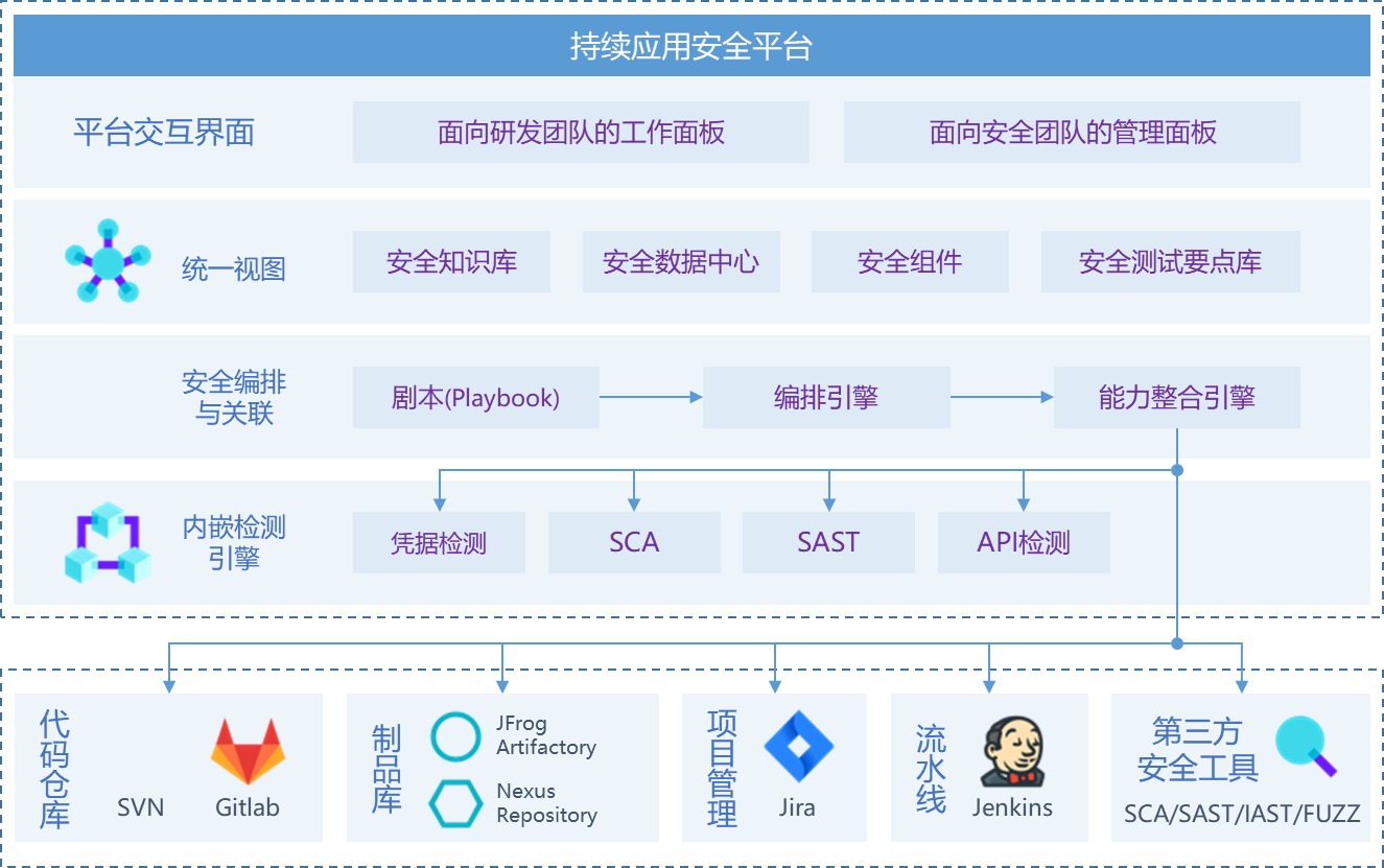 如果我们把CAS比作是一场篮球赛的话,那么细分工具链相当于篮球运动员,而ASOC起到了教练员的作用。在整体的过程中,ASOC对下需要参与安全工具的编排整合,对上需要承接企业安全开发管理流程,通过安全运营剧本完成指挥者的工作。
