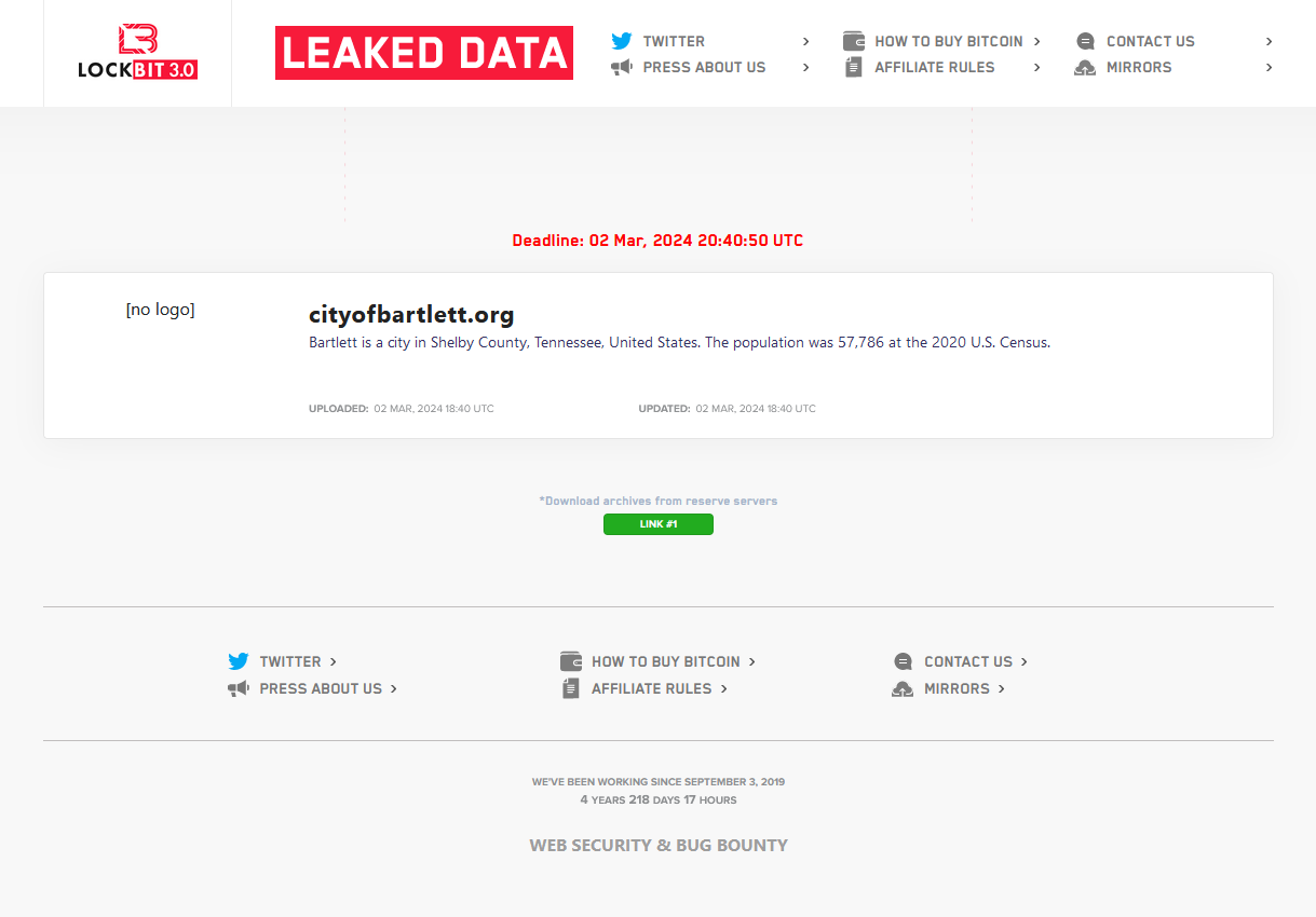 商业黑客组织lockbit3在2024.3.2公布了美国田纳西州谢尔比县下属城市Bartlett被勒索的信息。该部门未按照勒索组织的要求在规定期限内支付赎金,随后lockbit3公布了窃取到的所有数据。