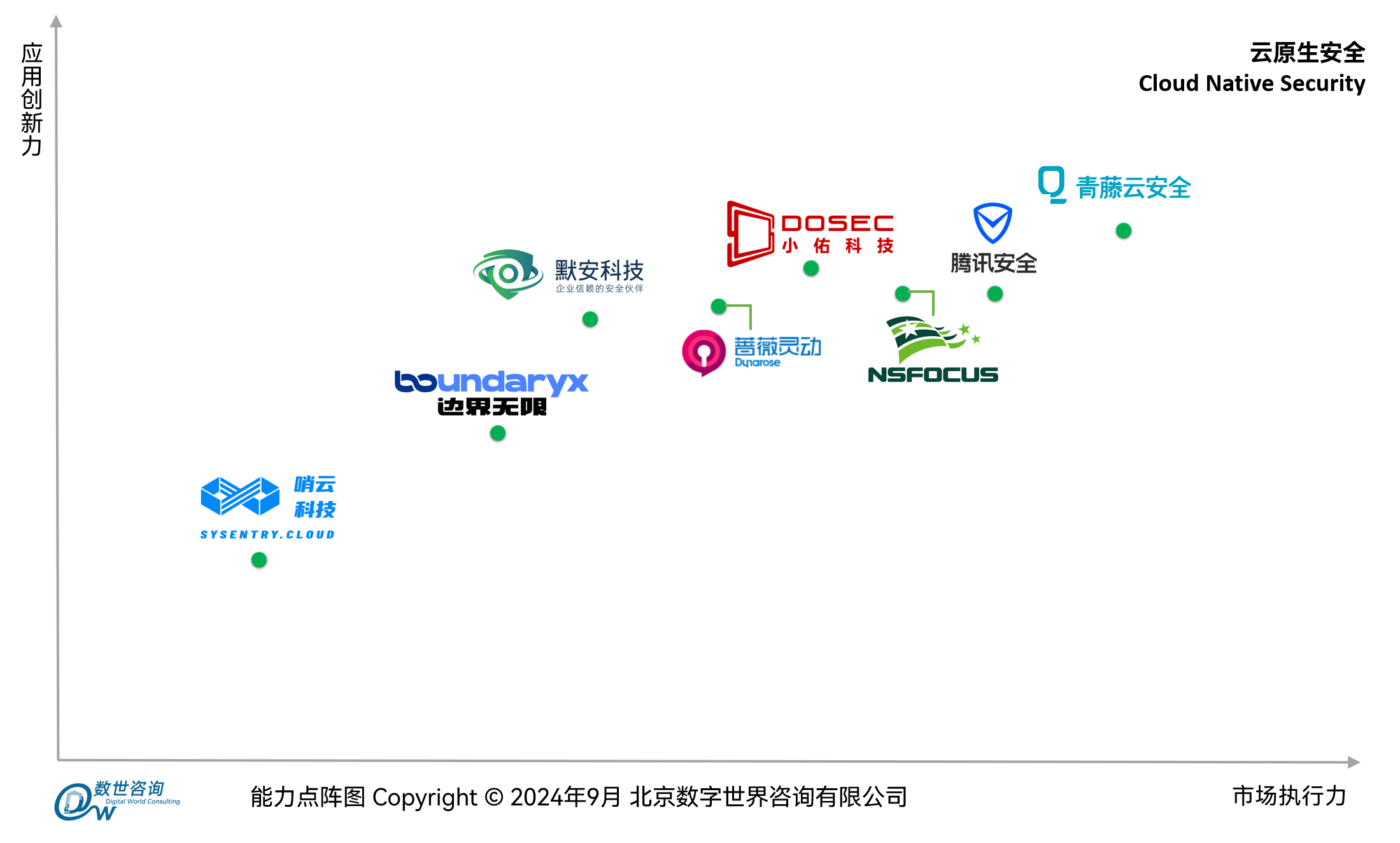国内9家具备云原生安全解决方案和产品的厂商参与了本次调研,分别是(按公司简称首字母排序):边界无限、绿盟科技、默安科技、蔷薇灵动、青藤云安全、山石网科、哨云科技、腾讯安全、小佑科技,按照横轴市场执行力、竖轴应用创新力,通过能力点阵图 的方式展现如下: