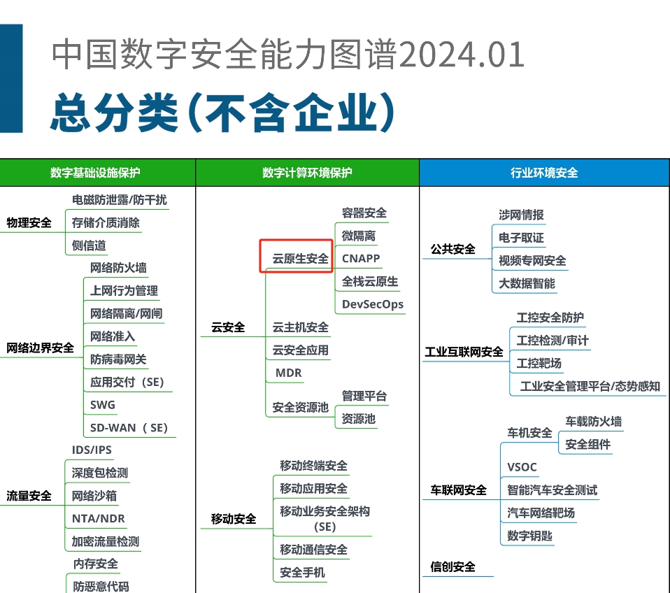 在 2024 年初,数世咨询发布的《中国数字安全能力图谱》中,云原生安全属于“数字计算环境保护”领域中“云安全”细分领域,如下图: