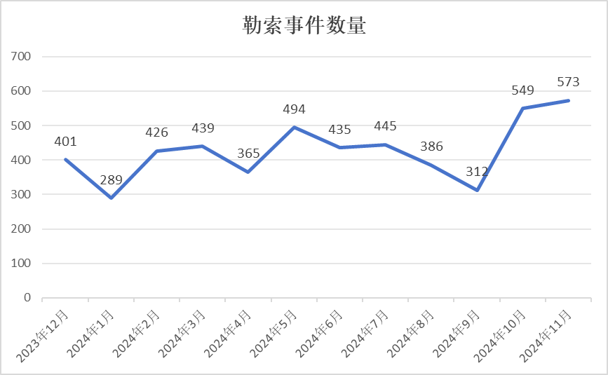 2024年11月全球活跃的商业黑客组织(有勒索发布行为)共38个,公开的勒索事件共573件,TOP 10的黑客组织如下所示: