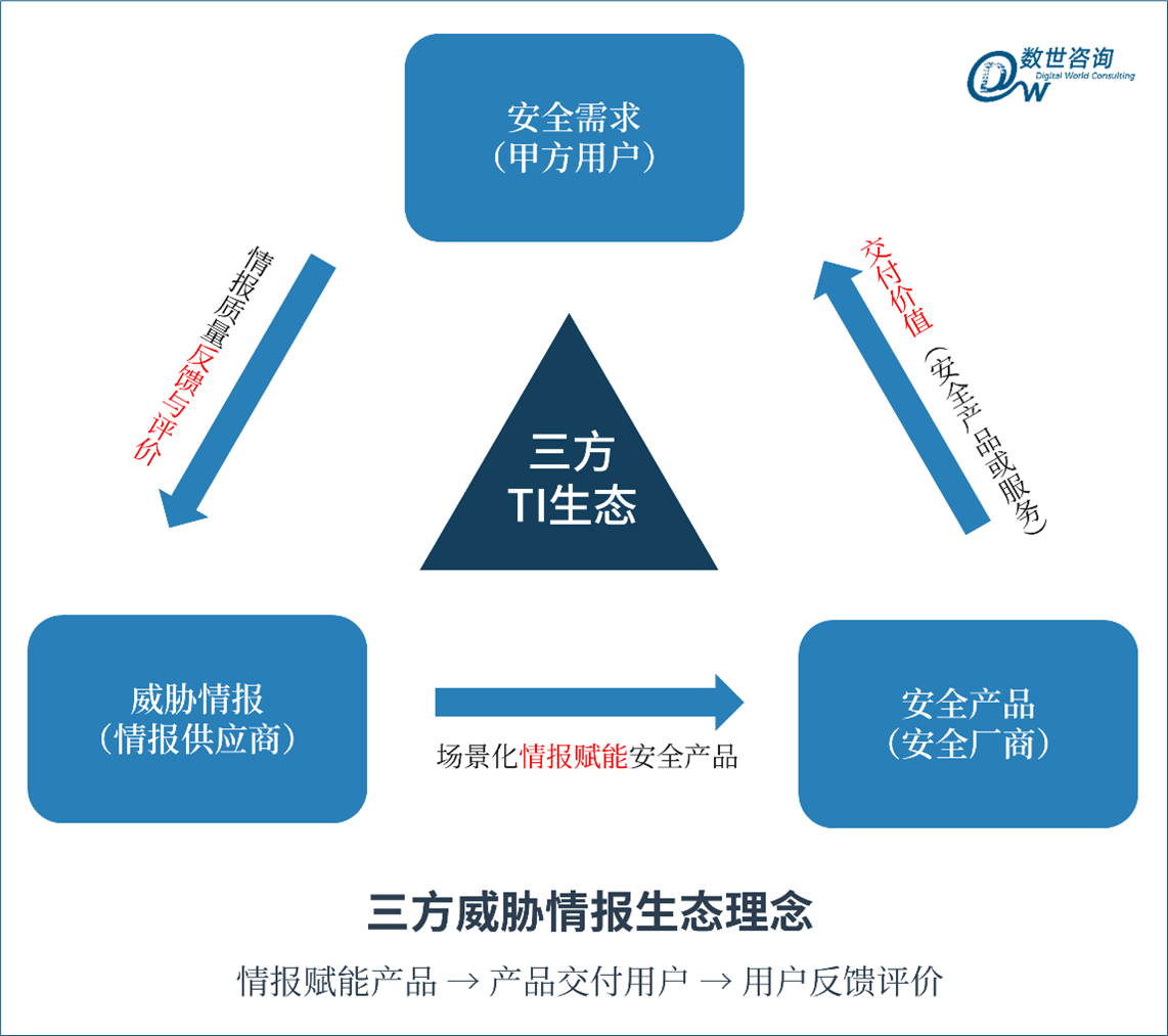 数世咨询提出“安全需求+安全产品+威胁情报”的三方威胁情报生态理念,构建“情报赋能+交付价值+反馈评价”的有机生态。