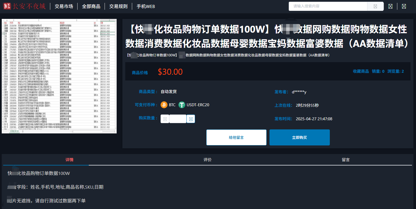事件描述:2025.4.27某暗网数据交易平台有人宣称正在售卖一份快*****用户网购数据。卖家称此份数据共100万条,数据字段包含姓名,手机号,地址,商品名称,日期等,此份数据的价格为30美元。