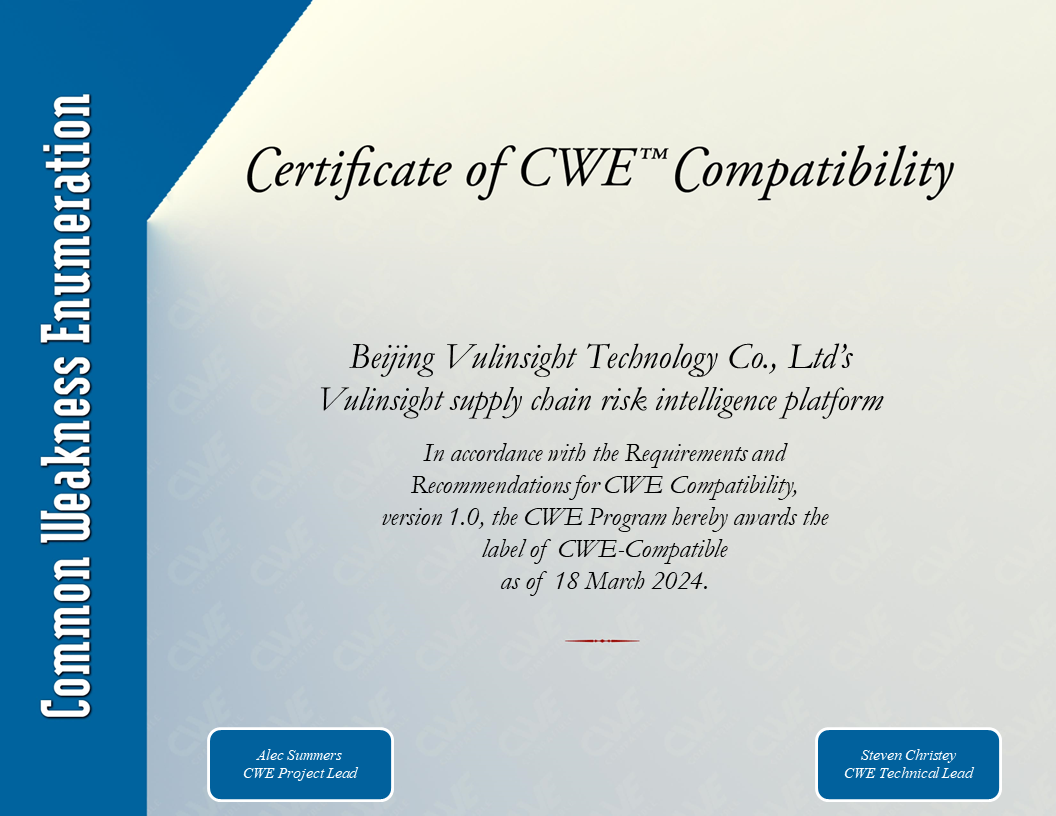 近日,北京摄星科技旗下的“软件供应链风险情报平台”获得了国际权威机构的专业认可,顺利通过CWE国际兼容性认证。