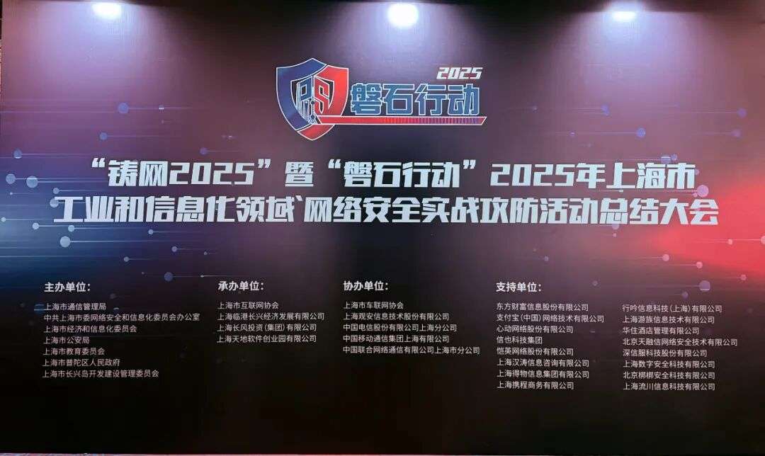 11月18日,上海市通信管理局联合市委网信办、市经信委、市公安局、市教委、普陀区人民政府和长兴岛管委会共同组织召开“铸网2025”暨“磐石行动”2025年上海市工业和信息化领域网络安全实战攻防活动总结大会,通报总结攻防成果并为优秀单位颁奖。