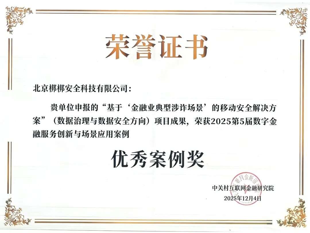 近日,“2025数字金融与科技金融大会”在京成功举办,本次大会由中关村金融科技产业发展联盟与中关村互联网金融研究院联合主办。会上隆重揭晓了“2025数字金融服务创新与场景应用案例征集”成果,梆梆安全凭借“基于‘金融业典型涉诈场景’的移动安全解决方案”获评优秀案例。