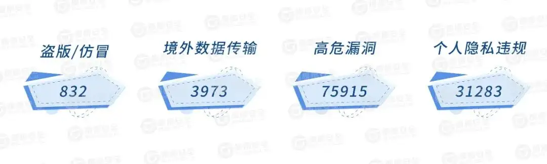 梆梆安全移动应用监管平台通过调用不同类型的自动化检测引擎,对全国Android应用进行抽样检测,风险应用从盗版(仿冒)、境外数据传输、高危漏洞、个人隐私违规4个维度综合统计,风险应用数量如图4所示: