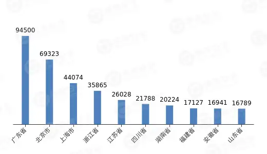 从APP的分布区域来看,广东省APP数量仍然位居第一,约占全国APP总量的20.63%,位居第二、第三的区域分别是北京市和上海市,对应归属的APP数量是69,323、44,074个。具体分布如图1所示: