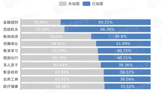 从应用类型来看,APP加固率排名前三的分别是金融理财、党政机关、新闻阅读类APP。不同APP类型加固占比如图13所示: