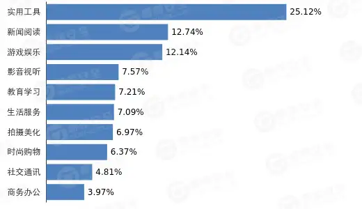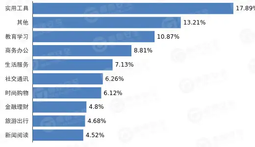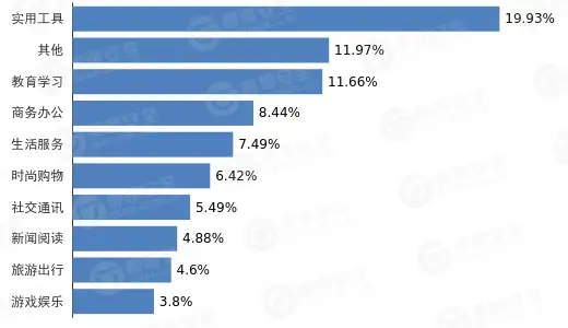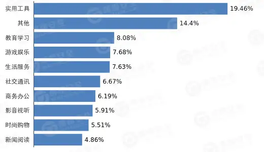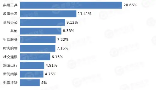 从APP的功能和用途类型来看,实用工具类APP数量稳居首位,占全国APP总量的20.66% ;教育学习类APP位居第二,占全国APP总量的11.41%;商务办公类APP排名第三,占全国 APP总量的9.12%。各类型APP占比情况如图3所示: