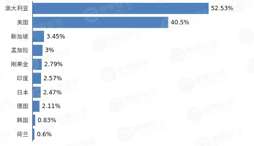 从全国的Android APP中随机抽取39,651款Android APP进行境外数据传输引擎分析,发现其中3,973款应用存在往境外的IP传输数据的情况,从统计数据来看,发往澳大利亚的最多,占比52.53%;其次是发往美国,占比40.5%。无论是针对移动应用程序自身程序代码的数据外发行为,还是针对第三方SDK的境外数据外发行为,都建议监管部门加强对数据出境行为的监管。数据传输至境外国家占比排行情况如图8所示: