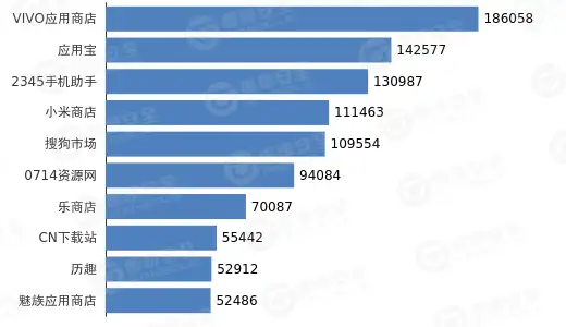 从APP的渠道分布来看,截止统计周期内,全国移动应用分发市场有1,324家,位居渠道排名前三的分别为VIVO应用商店、应用宝、2345手机助手。全国移动应用渠道分布如图2所示:
