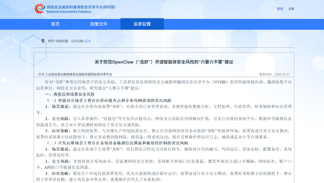 针对“龙虾”典型应用场景下的安全风险,工业和信息化部网络安全威胁和漏洞信息共享平台(NVDB)组织智能体提供商、漏洞收集平台运营单位、网络安全企业等,研究提出“六要六不要”建议。