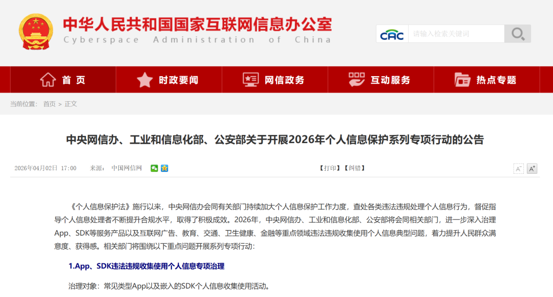 2026年4月,中央网信办、工业和信息化部、公安部联合发布公告,正式启动个人信息保护系列专项行动。本次行动将聚焦App、SDK、互联网广告、教育、交通、卫生健康、金融等重点领域,集中整治违法违规收集使用个人信息行为,并严厉打击相关违法犯罪活动。